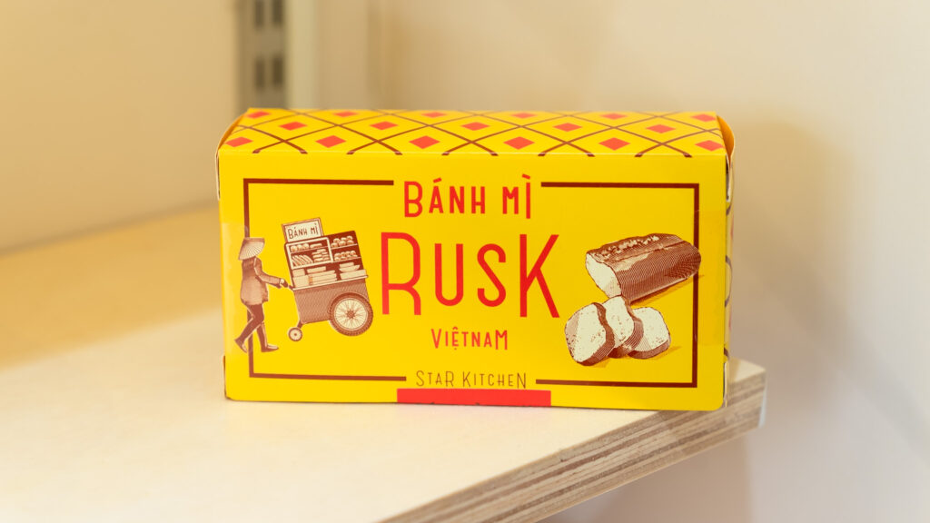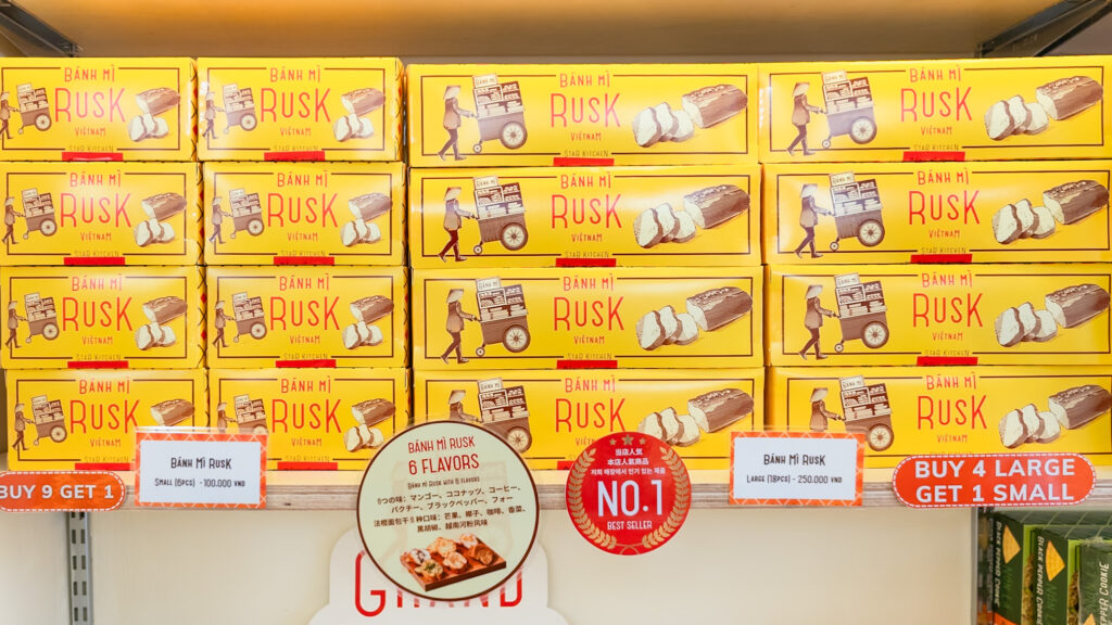 最も人気なのは「バインミーラスク(小):10万vnd(約600円)/(大):25万vnd(約1,505円)」。ココナッツ、マンゴー、フォー、コーヒー、パクチー、黒コショウの6種フレーバー入りで、ひと箱でベトナムらしさを感じられます。小サイズと大サイズがあり、個包装・軽量で職場や友人へのばらまき用に最適です。