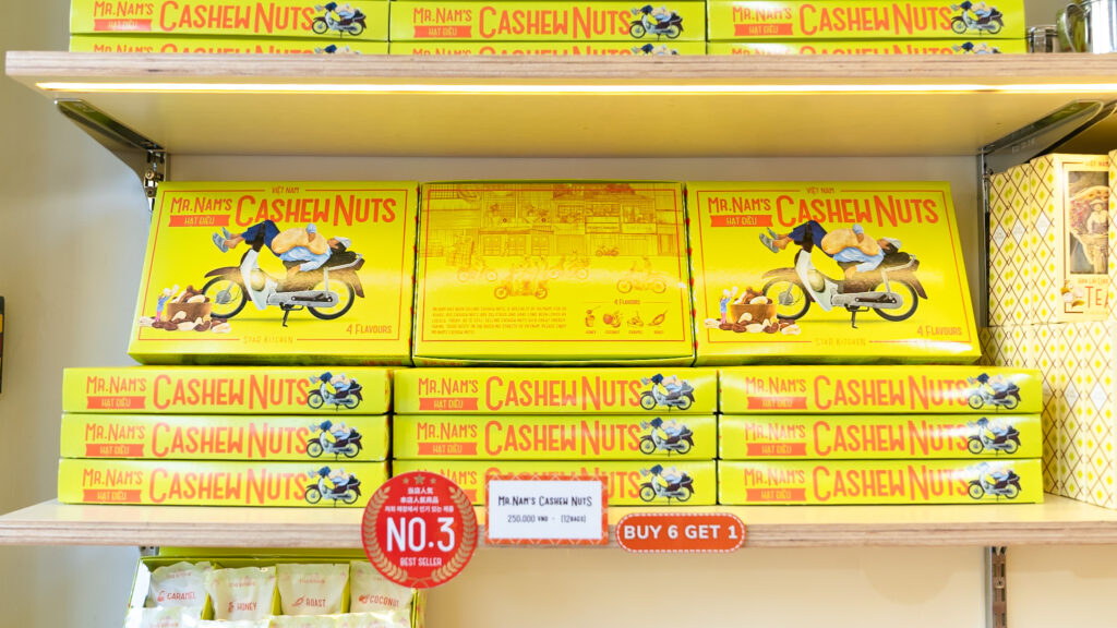 「ナムおじさんのカシューナッツ:25万vnd(約1,505円)」は、ロースト・キャラメル・ココナッツ・ハニーの4種セット。ユーモアのあるパッケージで、ギフト感があります。