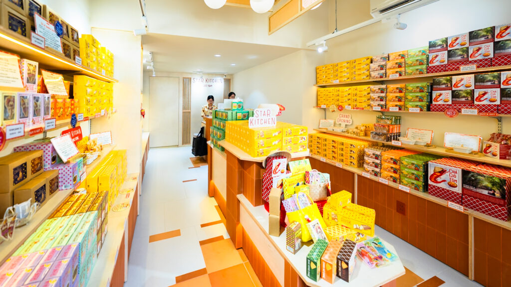 オープンしたばかりのピカピカの店内で、商品は棚にきれいに陳列されています。「スターキッチン」の全24商品が揃っており、「買い忘れたお土産がある」という場合でもここで完結します。