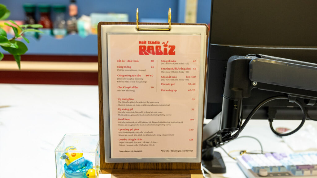 店頭のメニュー表を見ると、長さだしは概ね10万vnd(約595円)前後から、ワンカラーのジェルネイルは6万vnd(約355円)、ジェルオフは3万vnd〜4万vnd(約180〜240円)と、ベース料金もかなり良心的に設定されています。