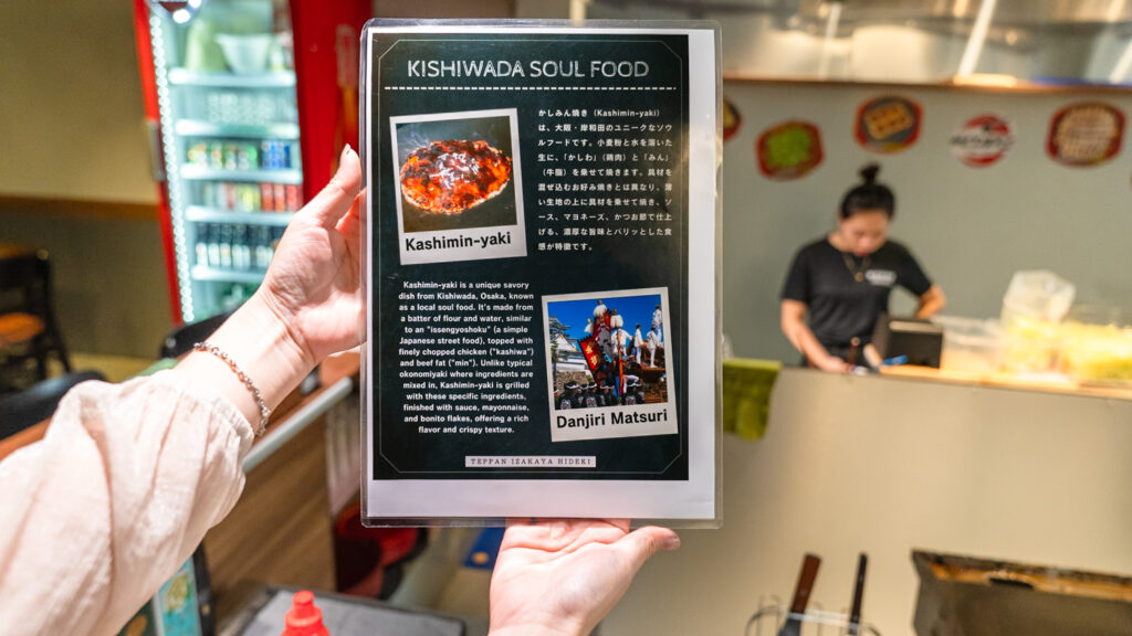 同店の最大の魅力は、大阪府岸和田市のローカルフードを忠実に再現している点です。 岸和田といえば、豪快なだんじり祭りに象徴されるエネルギッシュな街。その文化とともに育まれてきたのが、鉄板を囲みながら楽しむ庶民的な料理です。