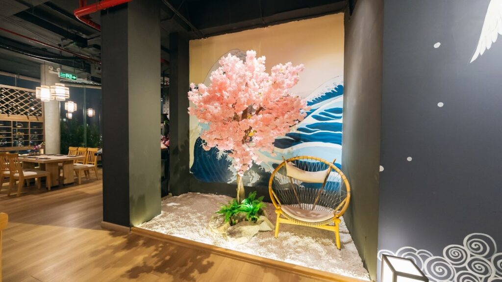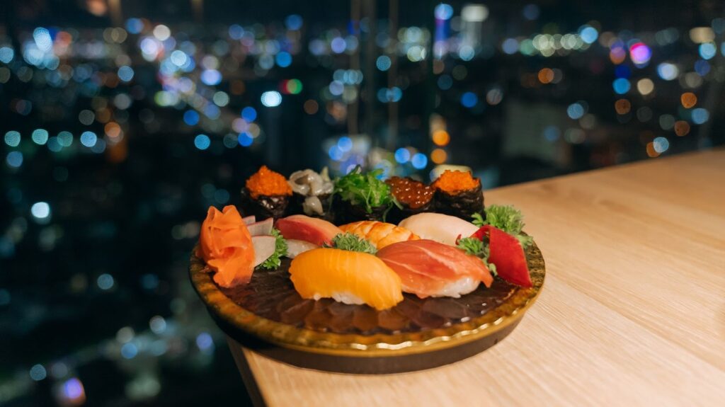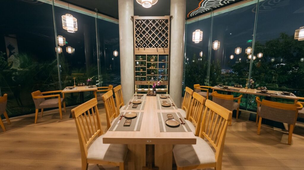 内装は日本を感じさせるデザインが随所に施されており、ベトナムにいながら日本の美学を感じられるのが特徴です。テーブルは木製で落ち着いた雰囲気を醸し出しており、どの席からも夜景が見える配置になっていました。