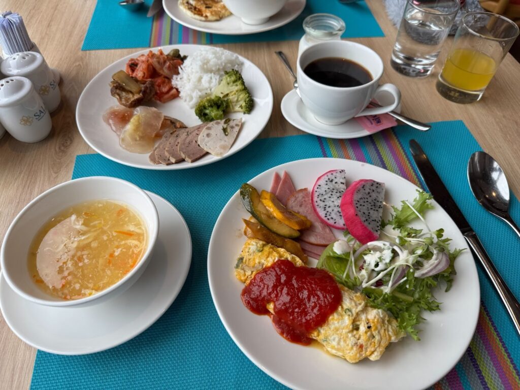平日にもかかわらず多くの観光客で賑わっており、特に韓国や欧米からのゲストが多い印象でした。ビーチを眺めながら世界各国の料理に舌鼓を打つ朝食は、一日の始まりに活力を与えてくれます。VIP専用スペースも設けられており、より静かな環境で特別な朝食をゆったり楽しむことも可能です。