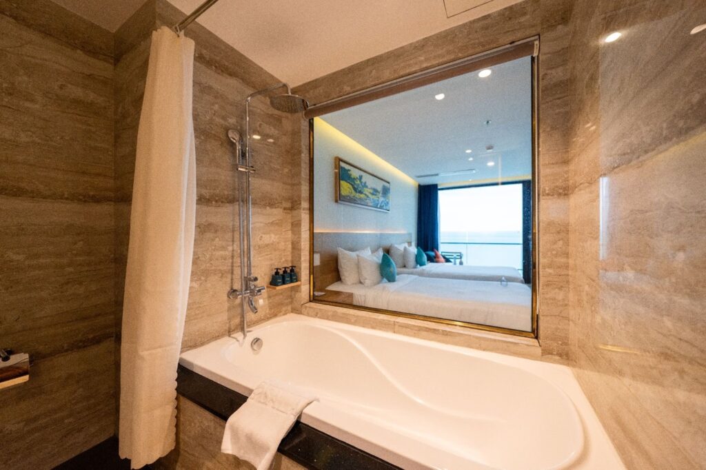 バスタブも完備、清潔感と温かみのあるオーシャンビューの客室