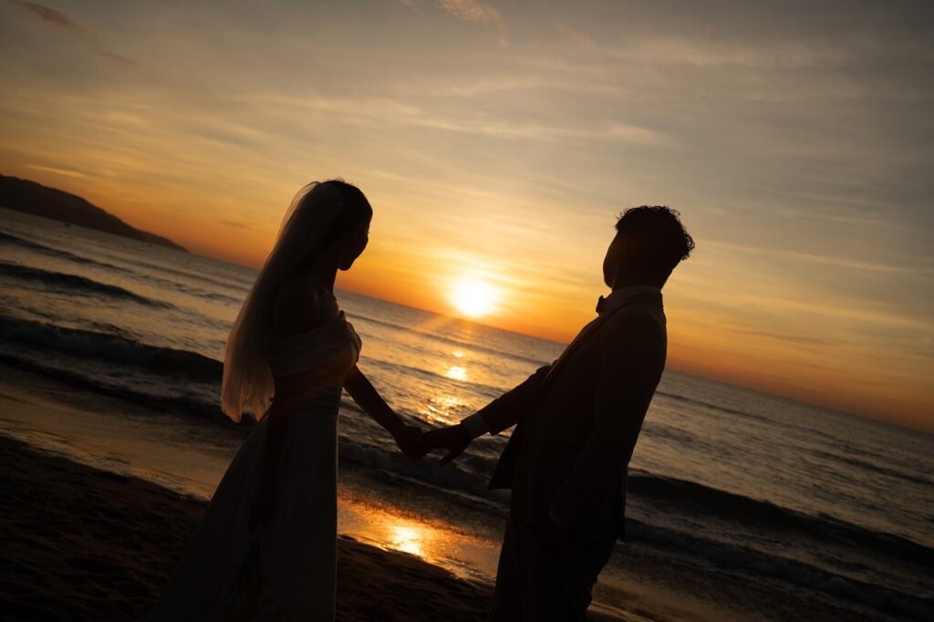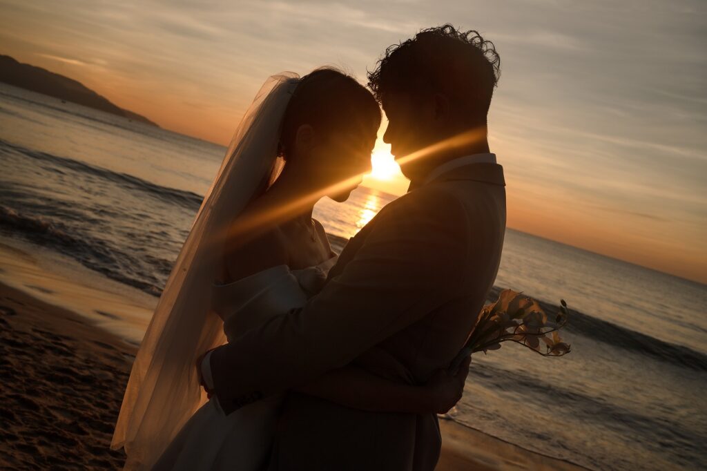結婚指輪やお揃いのジュエリーを着けた手元に朝日を重ねることで、ウェディングフォトとしても完成度の高い一枚になります。砂浜にイニシャルを書いて撮影するのも、遊び心があっておすすめです。