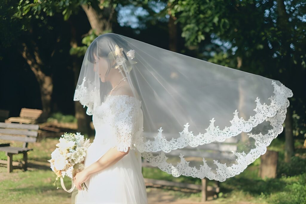 ベールは風を活かした撮影に欠かせない存在で、長さは2.5〜3.5メートル程度が最もバランスがよく、ドラマチックな印象に仕上がります。軽くなびかせたい場合はレースのみのベール、刺繍やビーズ入りのデザインは自然で上品な揺れ感が魅力です。小物はレンタル可能な場合もありますが、好みのものを持参すると、より思い出深い一枚を残せます。