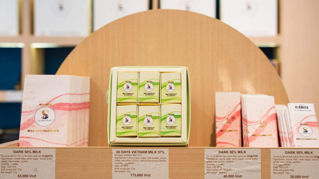 77S Chocolateは、ダナン中心部で気軽に立ち寄れるチョコレートショップです。小さな店内にはベトナム産カカオを使ったチョコレートが整然と並び、シンプルなタブレットから華やかなフレーバー入り、ギフトボックスまで種類豊富に揃っています。