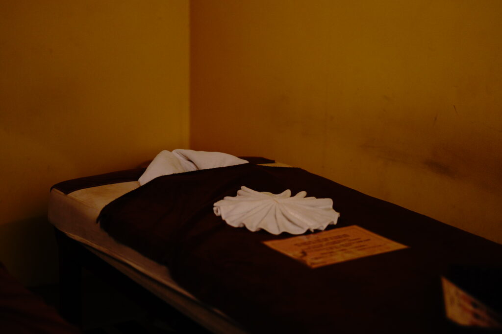 施術台に横になると、厚手でふわふわのタオルが体を包み、ふわっと広がるハーブの香りに包まれます。最初はうつ伏せで、脚、背中、肩の順に丁寧にマッサージが始まります。温かいハーブバッグを手足に置いて、末端からじんわりと温める工程がとても心地よく、深いリラックス感をもたらしてくれます。