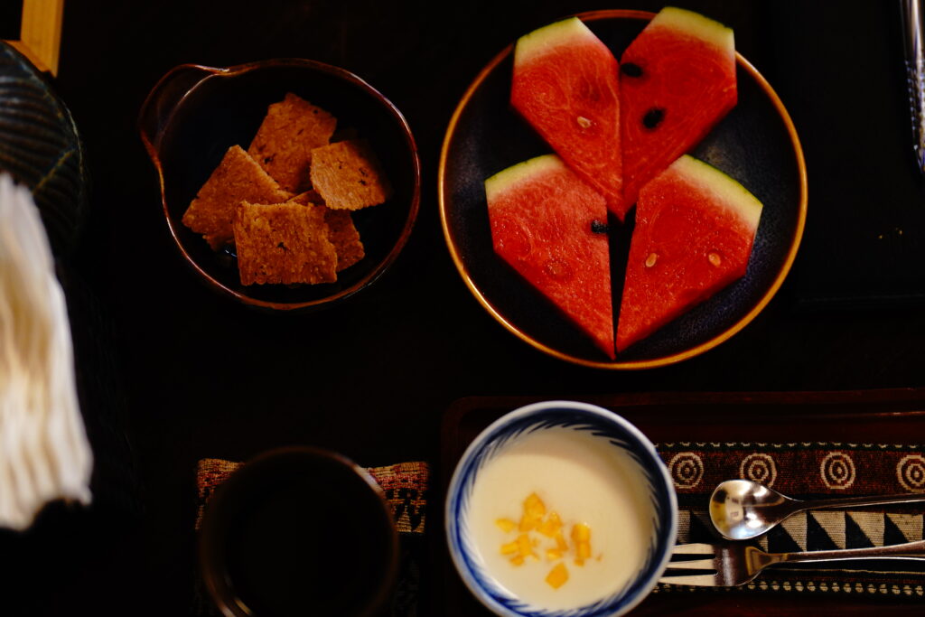 施術後は1階に戻り、スイカ、ココナッツサブレ、ハーブティー、マンゴーヨーグルトが提供されました。スイカはみずみずしく甘く、施術後の体に染みわたるおいしさでした。施術を終えた他のお客さんも静かにお茶を楽しんでおり、全体的に落ち着いて静かな空間です。