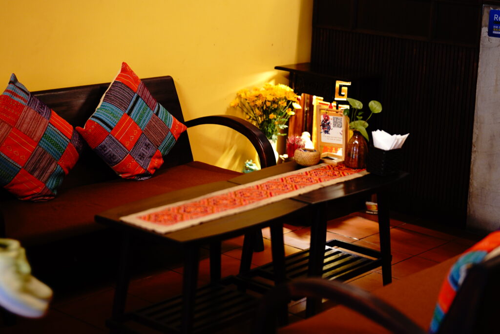 待合スペースはこぢんまりしていて、グループ用のソファ席や少人数用の席がありました。イスにはブラウンのクッションが敷かれ、カラフルな民族柄のクッションがアクセントになっていて、座り心地もよくリラックスできます。テーブルには刺繍入りのテーブルランナーが置かれ、細部まで温かみのある空間作りがされていました。
