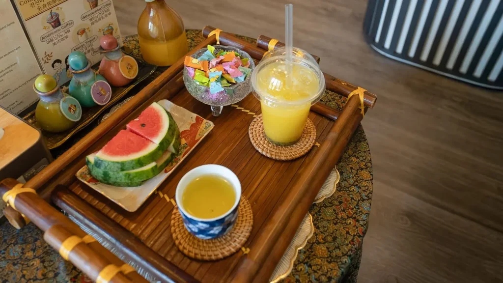 来店すると、ウェルカムドリンクとしてお茶と冷たいおしぼりが用意されます。マッサージ後にはドリンクやフルーツが提供され、今回は爽やかなパッションスムージーをいただきました。施術前後に、リラックス気分を味わえる素敵なおもてなしです。