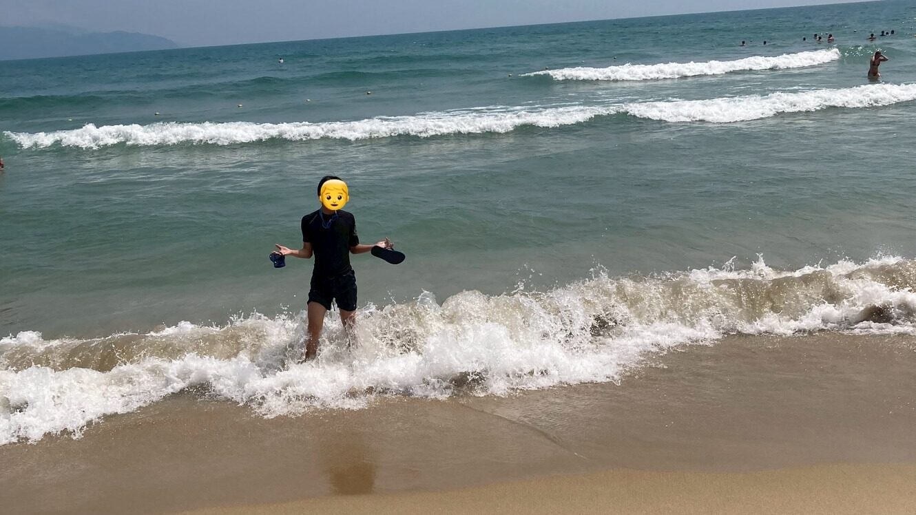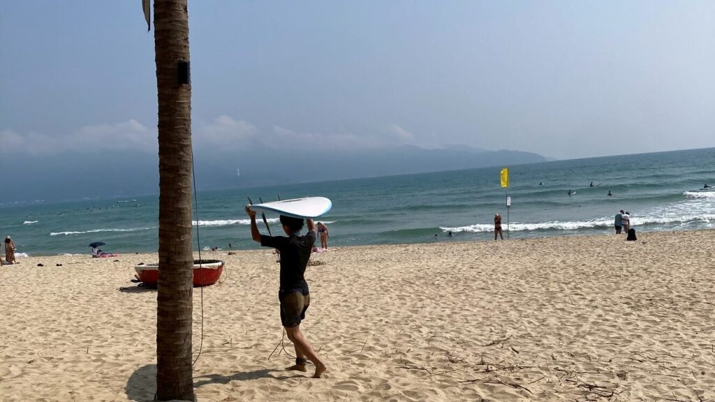 ホテル前のミーケービーチでは、息子が初めてのサーフィンに挑戦しました。ビーチにあるテントのレンタルショップで板を借り、ベトナム人のスタッフが翻訳機を通じてその場で乗り方を教えてくれました。