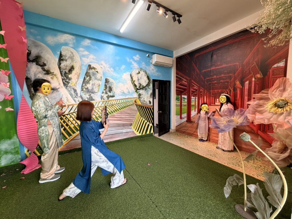 60分のプランで好きなアオザイを選んで着替え、店内のスタジオで写真撮影。ランタンの壁やドラゴンブリッジ背景のセットがあり、そこで自由にスマホで写真撮影ができます。