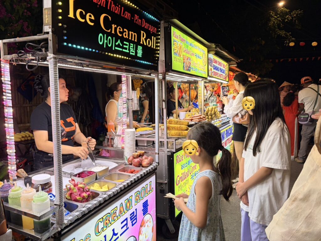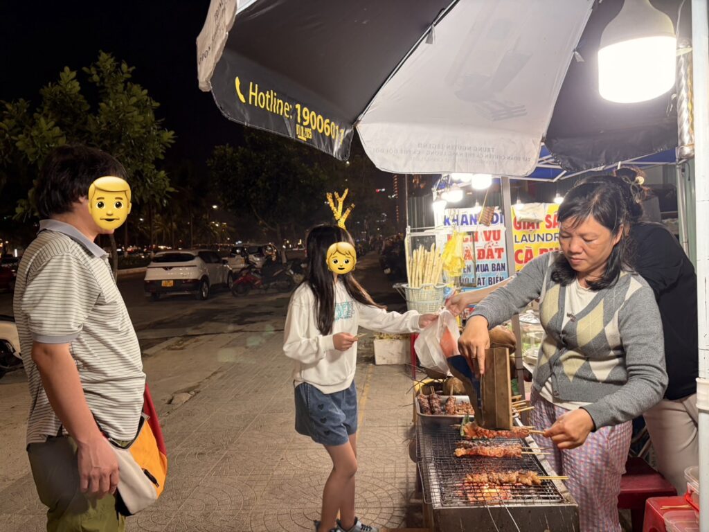 子どもたちが一番テンションが上がっていたのは、ホイアンのナイトマーケットで食べた屋台のタコでした。タコは小ぶりのものを焼いた料理で、気に入りすぎて旅の間に3回も食べていました。ナイトマーケットのグルメは少し高めではありましたが、清潔感があって安心して買えたのも嬉しいポイント。