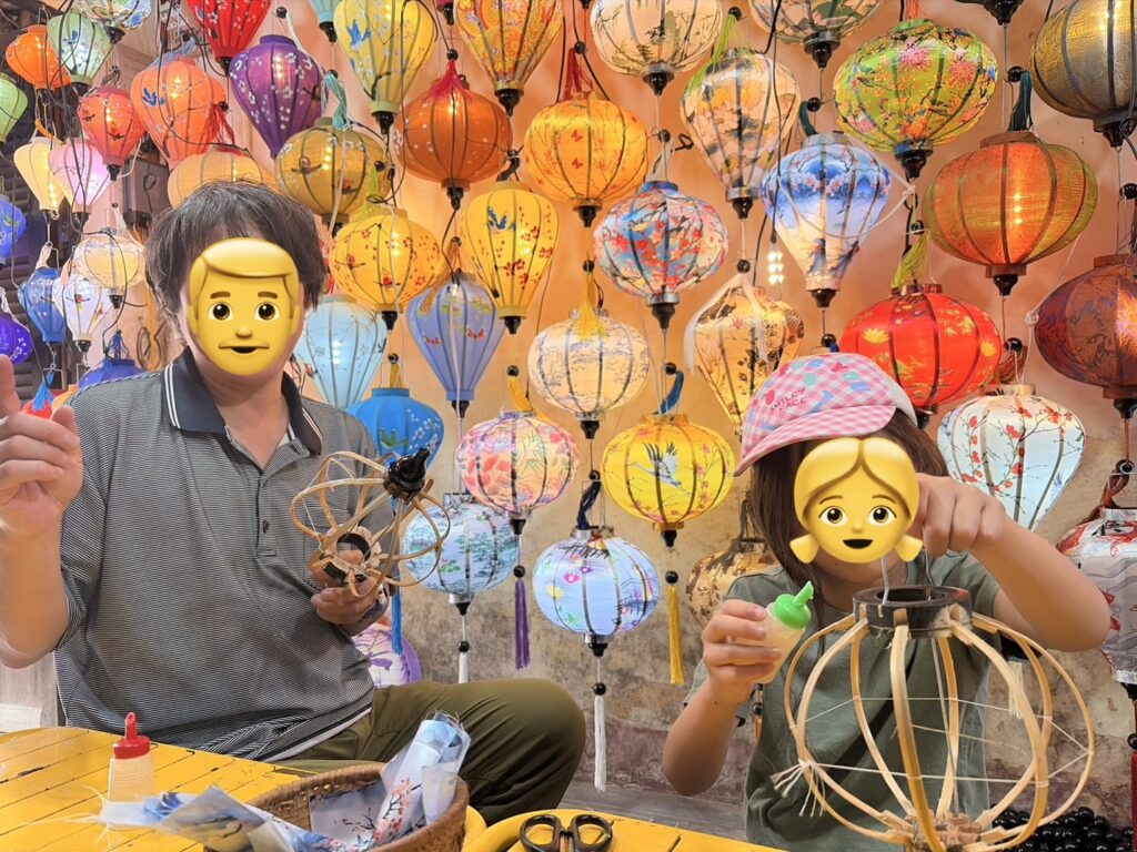 まずランタン作り。旧市街を歩いていて見つけたお店に飛び込みで入り、体験させてもらいました。布を選んでノリで貼るシンプルな作業ですが、家族4人それぞれ個性が出て盛り上がりましたし、小さい子でも作れる難易度なのでファミリーに本当におすすめです。作ったランタンはかさばりますが、そのまま特別なお土産になるのは良いですね。