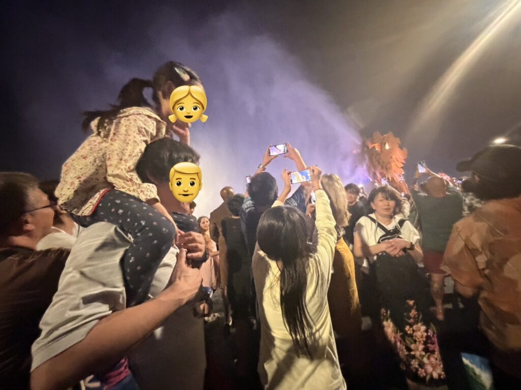ファイヤーショーには2回行きました。1回目は橋の上からショーを観覧。ドラゴンの口に近い場所で見たので迫力は十分でしたが、水はかからない距離でした。